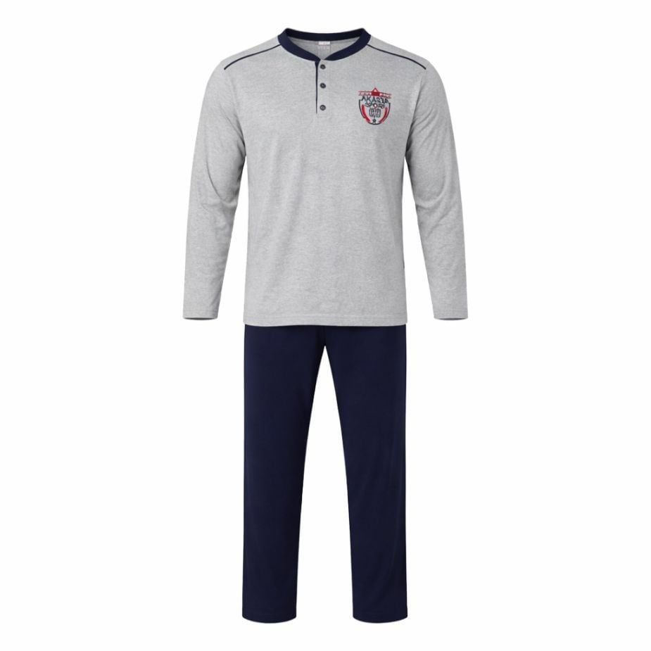A modell világosszürke felsőrésszel és sötétkék nadrággal készül, így klasszikus, visszafogott megjelenést kínál otthoni viselethez.