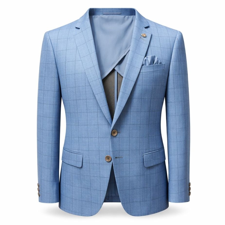 A zakó karcsúsított (slim fit) fazonja kiemeli a test vonalait, míg a világoskék kockás minta modern és stílusos megjelenést kölcsönöz. Tökéletes választás azok számára, akik szeretnék ötvözni a klasszikus eleganciát a modern divatirányzatokkal.