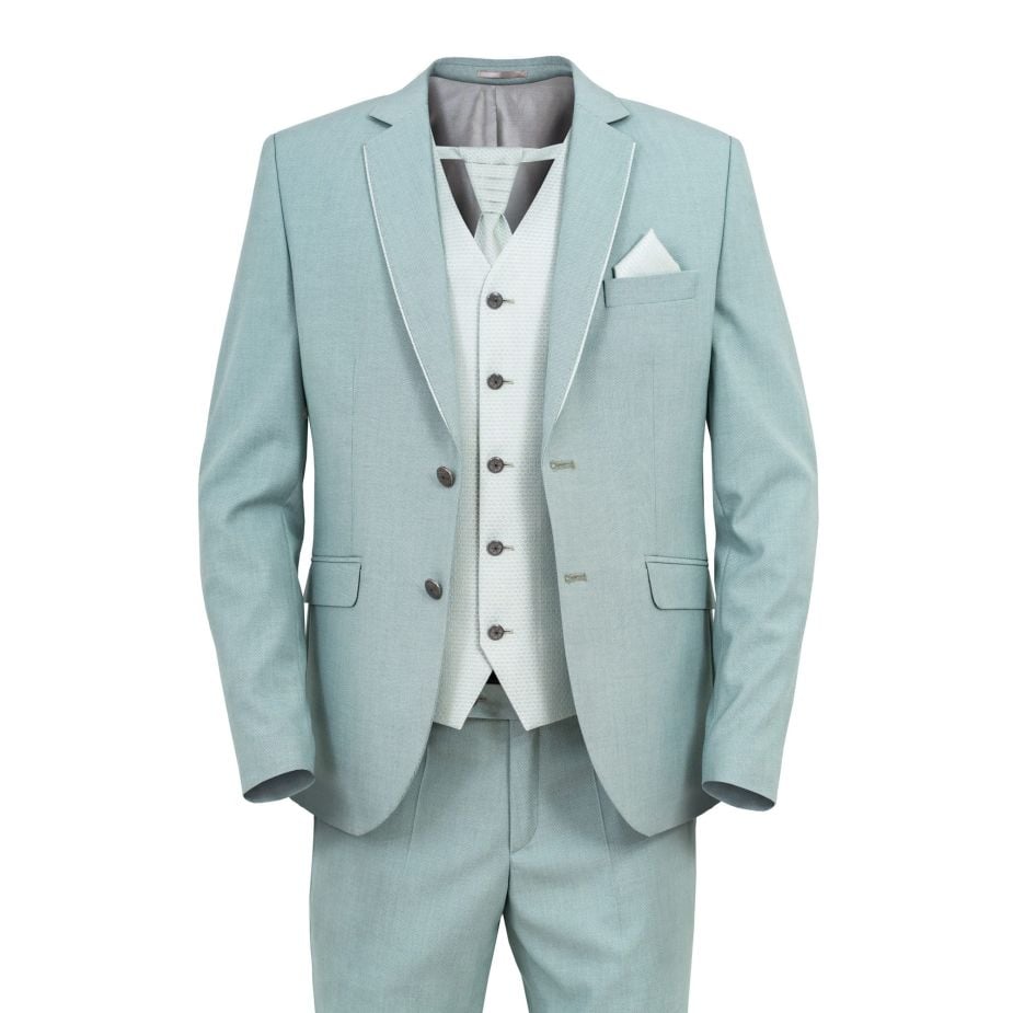 - Az egyszínű zakó és nadrág könnyű és kellemes viseletet biztosít a melegebb időjárásban is. A mintás mellény színessé és érdekessé teszi az összhatást, miközben a színben hozzáillő csokornyakkendő és díszzsebkendő eleganciát és stílust sugallnak.