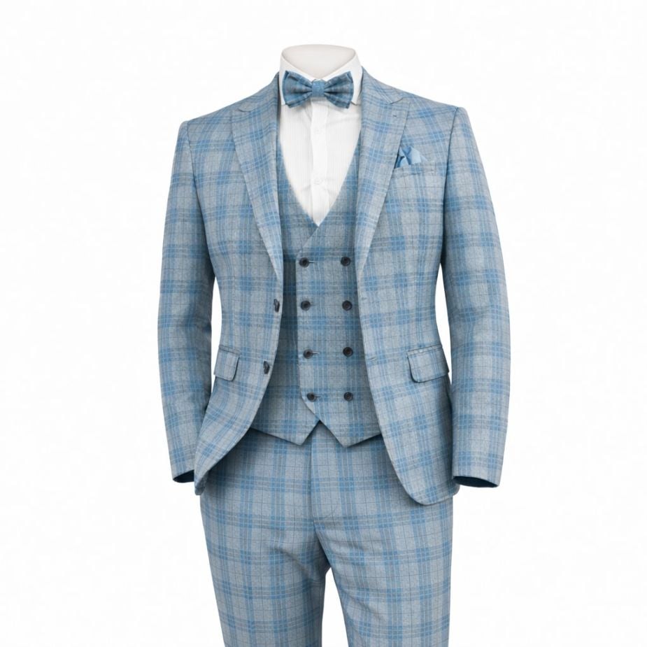„Manzetti 5 részes szürke-kék kockás, kockás nadrág karcsúsított stretch öltöny” értékelése elsőként
