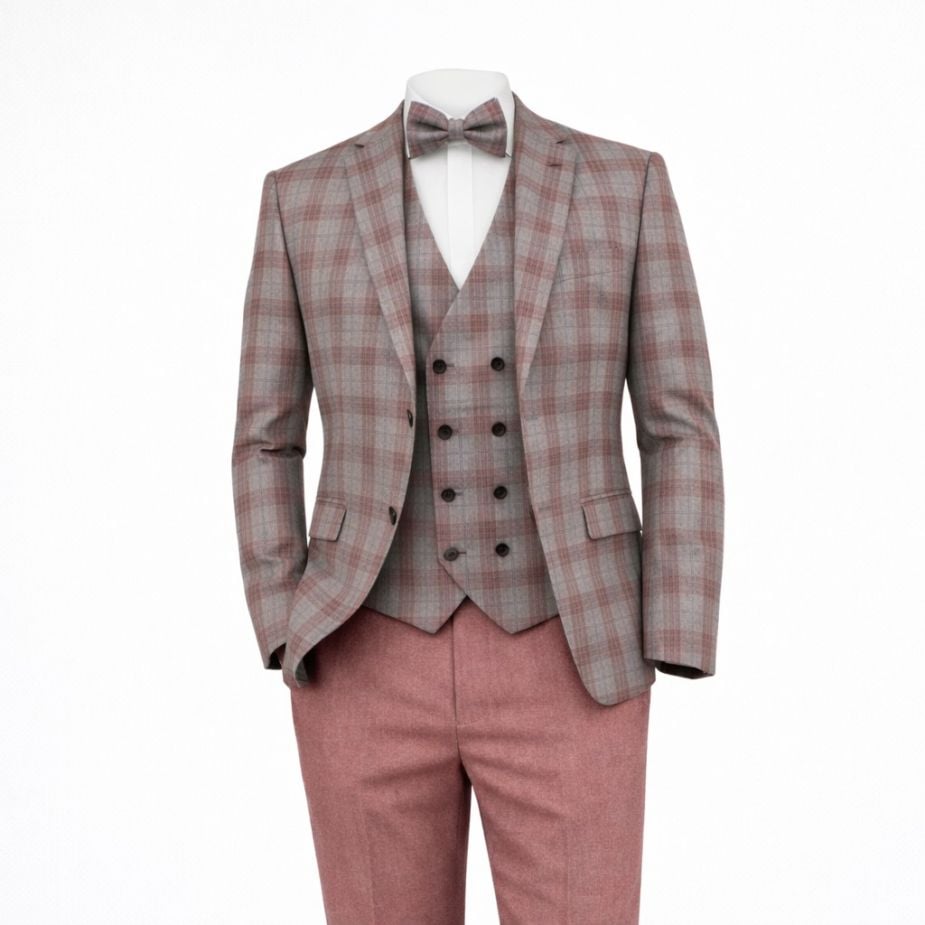 „Manzetti 5 részes szürke-mályva kockás, egyszínű nadrág karcsúsított stretch öltöny” értékelése elsőként